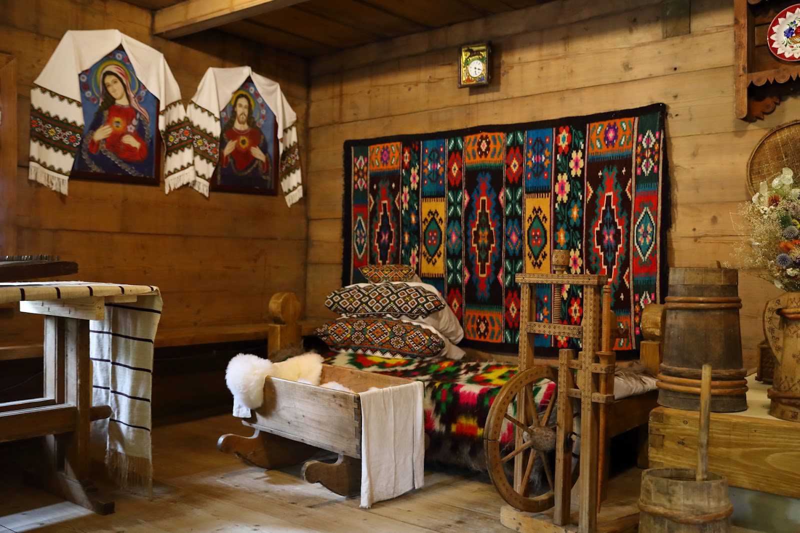 Краеведы подробно воспроизвели интерьер в столетних деревянных домах и согласно старым фотографиям расставили бытовые вещи владельцев, одежду, иконы, полотенца, ковры, которые в полной мере передают неповторимую атмосферу и дух того времени.