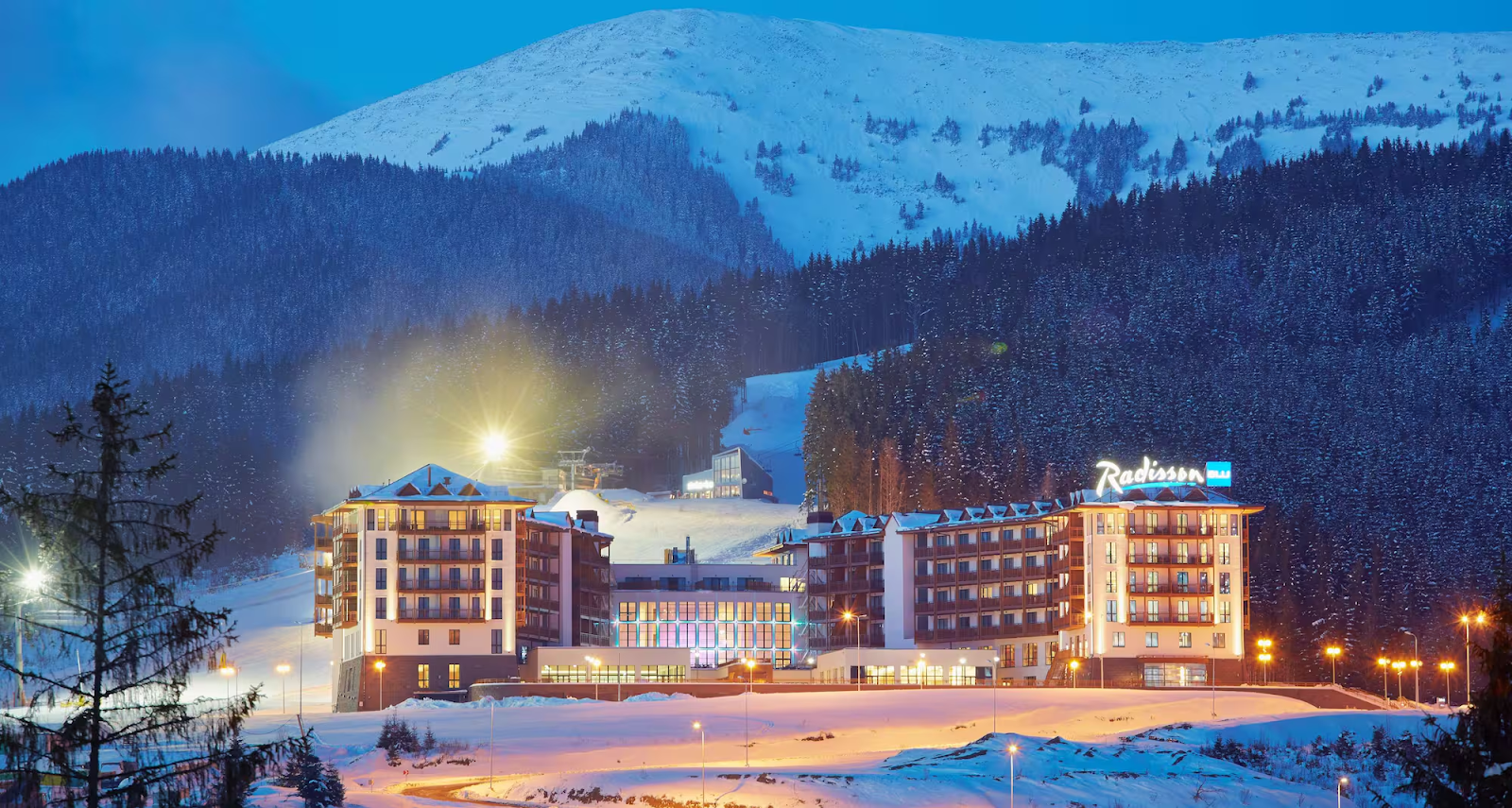 Radisson Blu Resort — это пятизвездочный отель. Он расположен в самом сердце горнолыжного курорта Буковель. Комплекс размещен непосредственно возле подъемника №7. Открытый в 2012 году, отель предлагает 252 номера, оформленные в альпийском стиле с панорамными окнами и балконами, открывающими захватывающие виды на Карпаты.