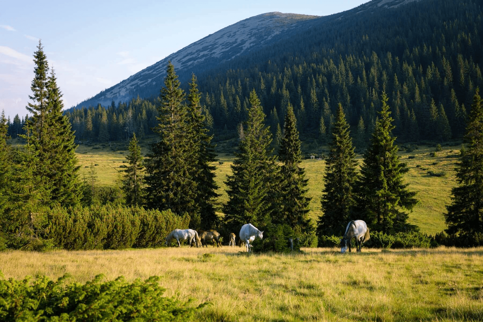 Верховинський національний природний парк багатий на ліси, які вкриті пишними зеленими ялинами.